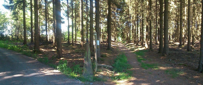Point 15 : LES BLANCS BOIS (Alhoumont) : Avant de rejoindre la vallée de l'Ourthe à travers les "Blancs Bois", le chemin offre quelques belles perspectives vers la Baraque de Fraiture.