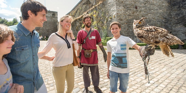Vu la nature du site, il est impossible de permettre une visite de l’ensemble du château aux personnes en fauteuil roulant. Nous vous conseillons dès lors de limiter le parcours uniquement à la Cour d’Honneur, permettant ainsi aussi l’accès au spectacle de rapaces. Ce parcours se fera toujours bien entendu en étant accompagné.
